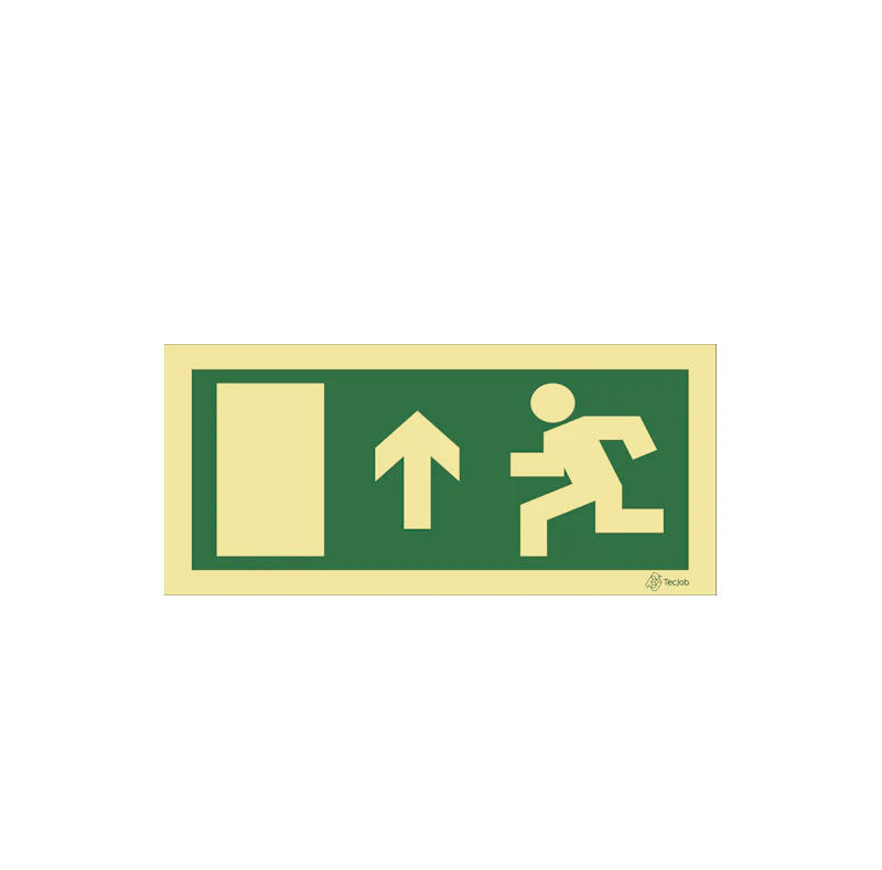 Placa de sinalização de saída de emergência com inscrição "Saída em Frente", fabricada em material fotoluminescente de alta qualidade. Ideal para indicar rotas de evacuação em ambientes com pouca ou nenhuma iluminação.
