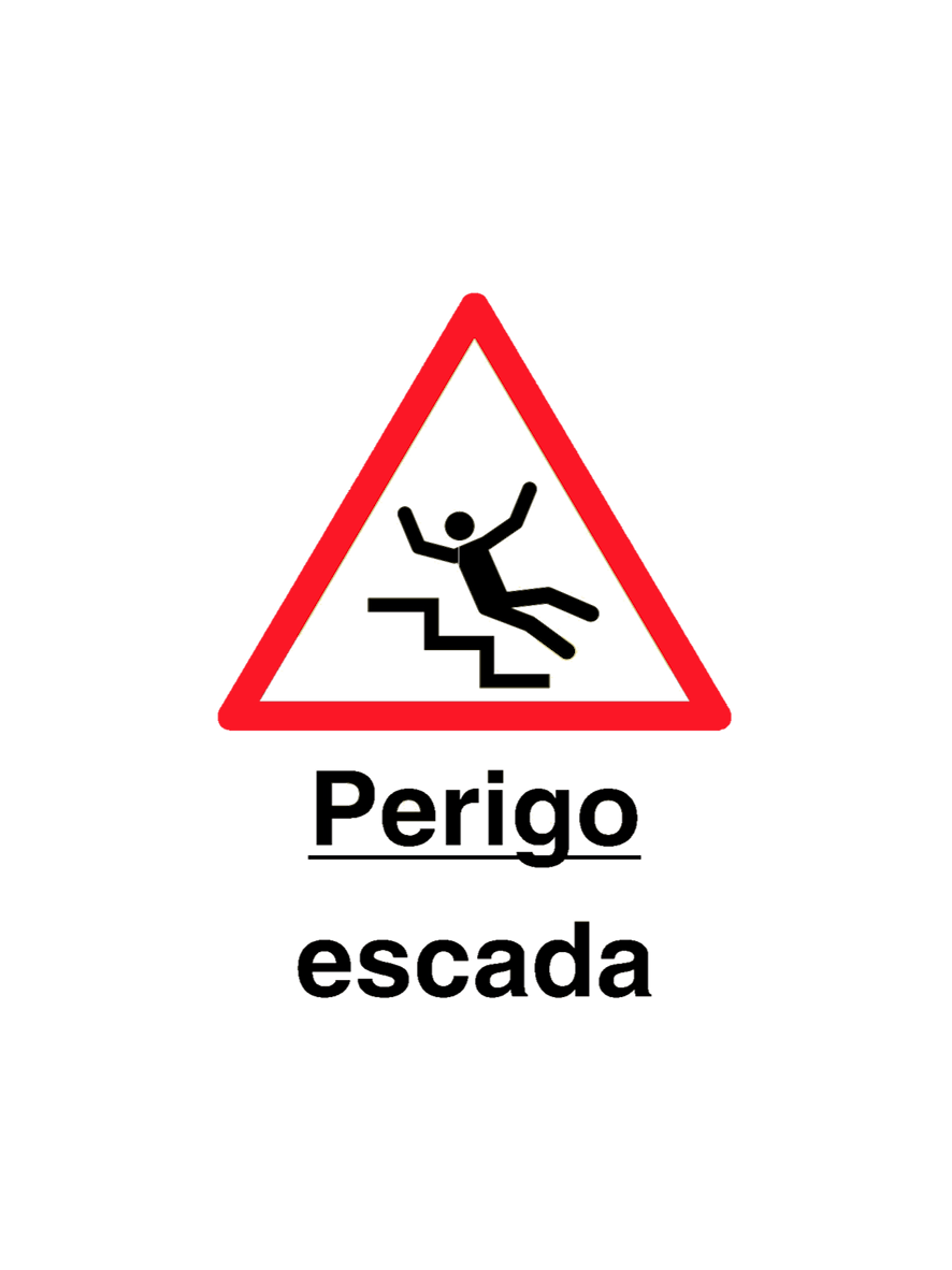 - Mensagem clara de alerta: “Perigo Escadas” ou “Cuidado Escadas”